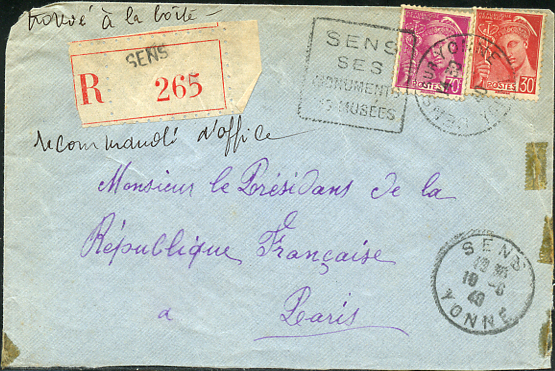 Par exemple, cette lettre adressée à au président de la république, Albert Lebrun, en juin 1940 et affranchie à un franc au tarif lettre de la lettre simple a reçue une recommandation d’office quand le postier a constaté la qualité du destinataire.